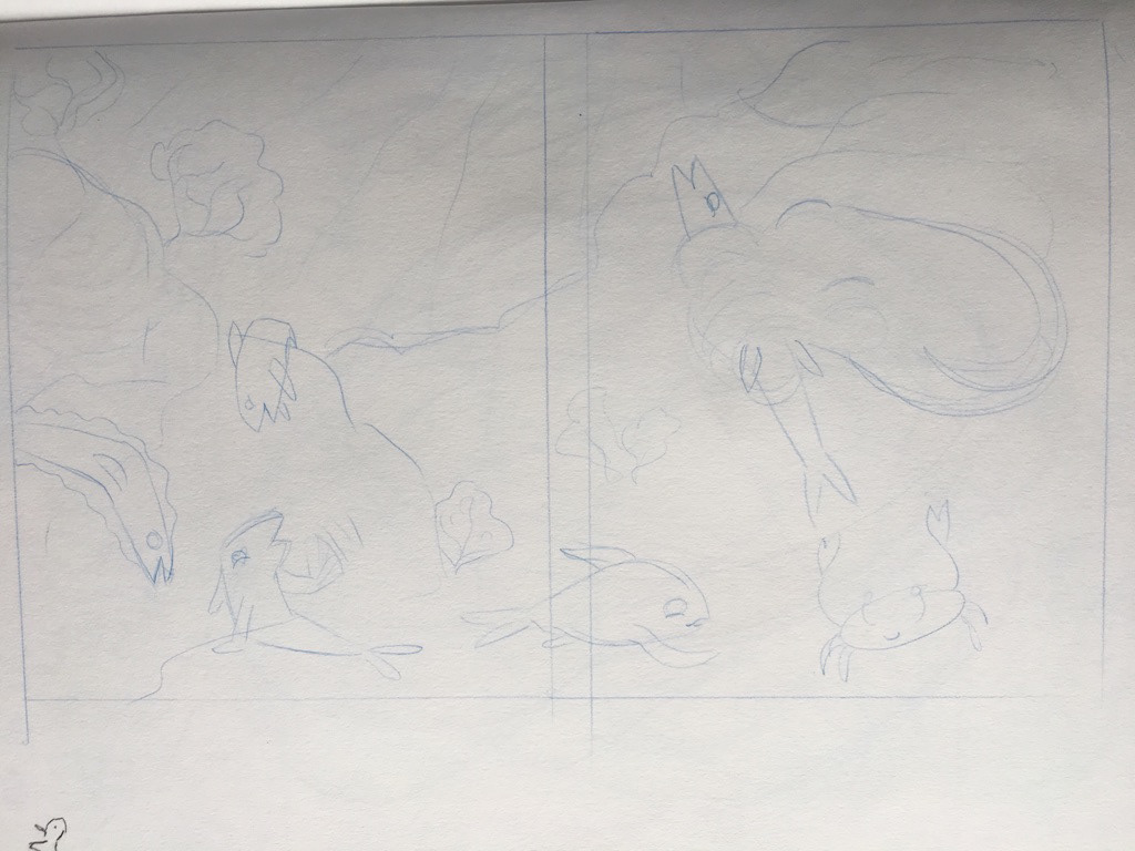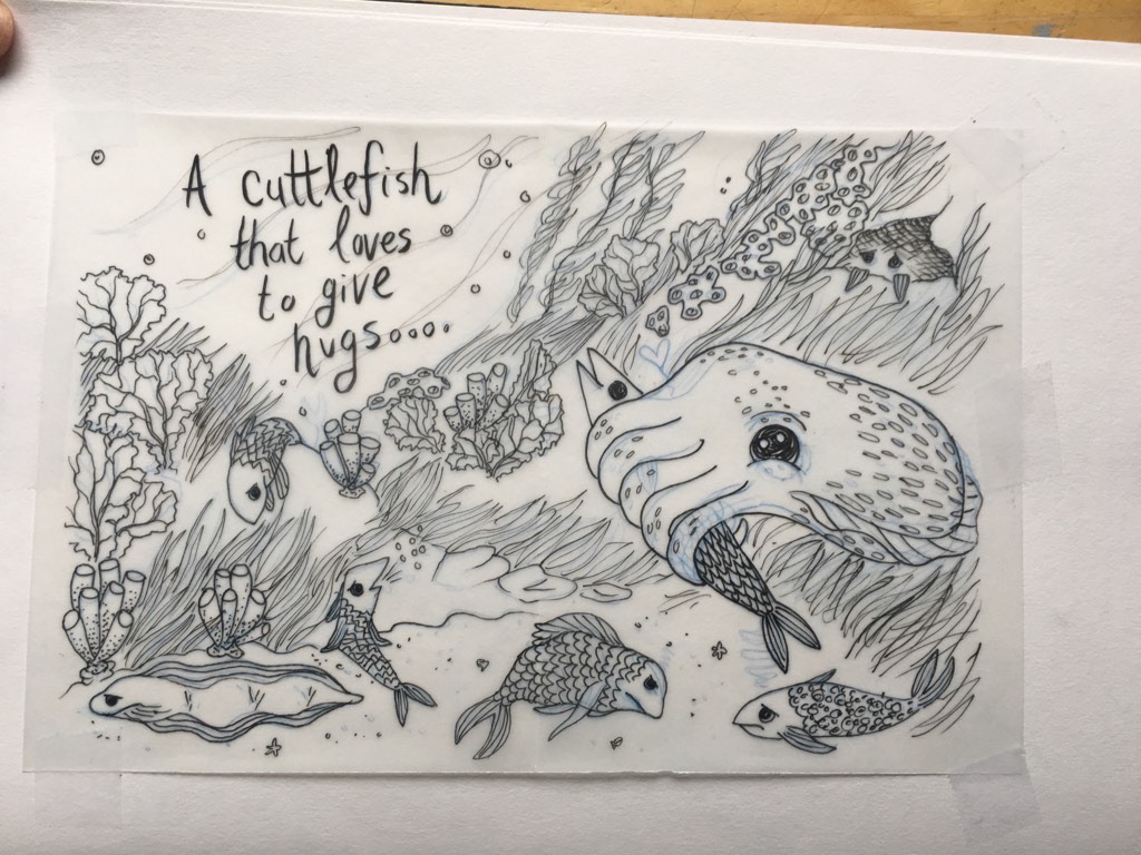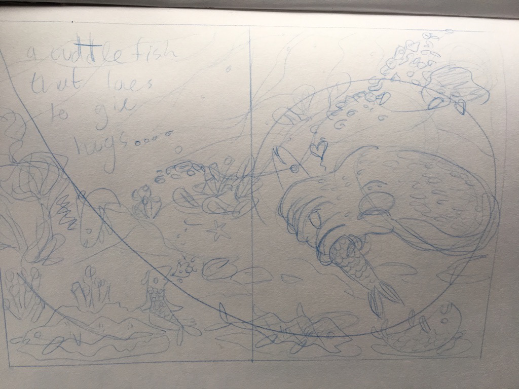 A spread for an ocean themed children's colouring book, featuring a cuttlefish that loves to cuddle.