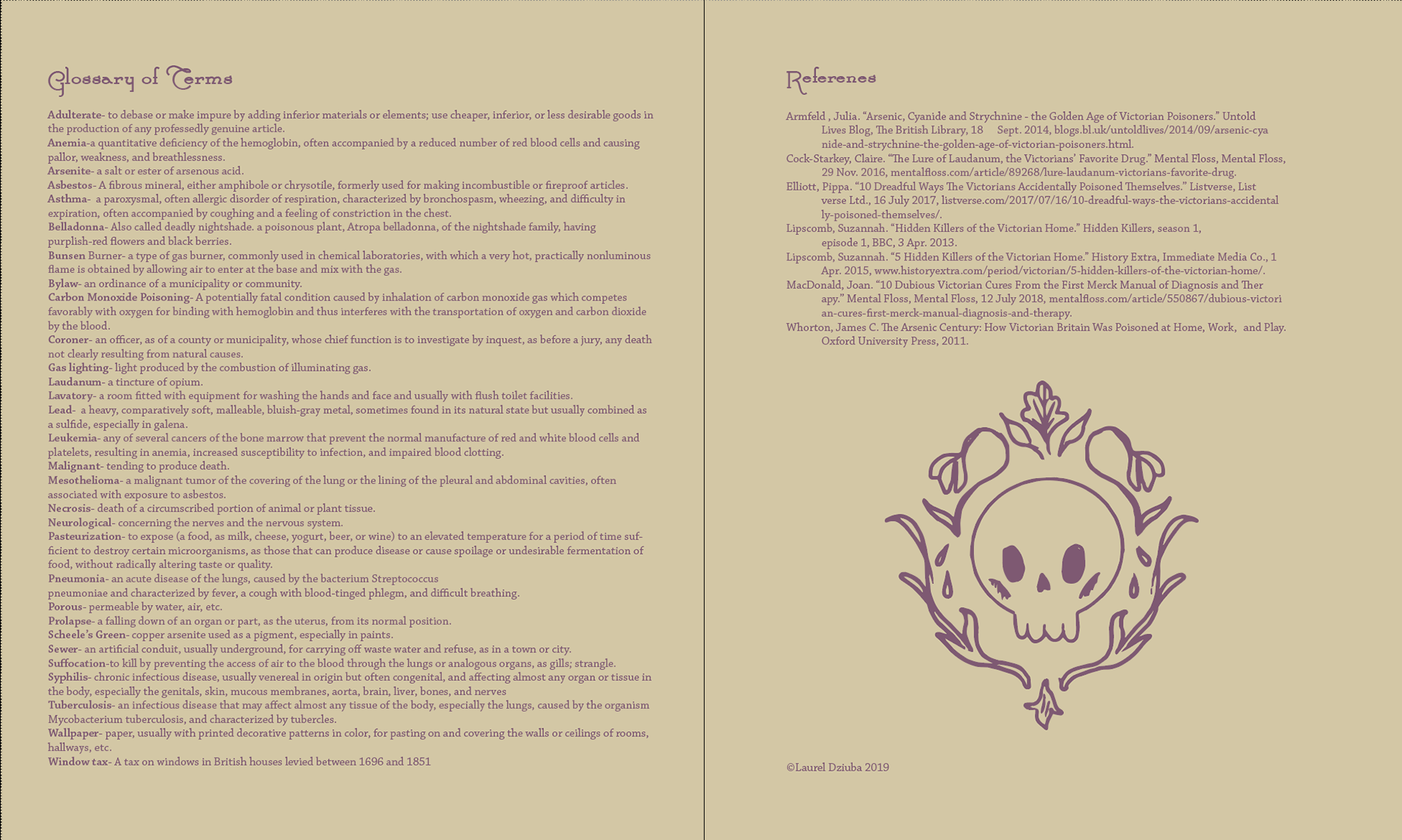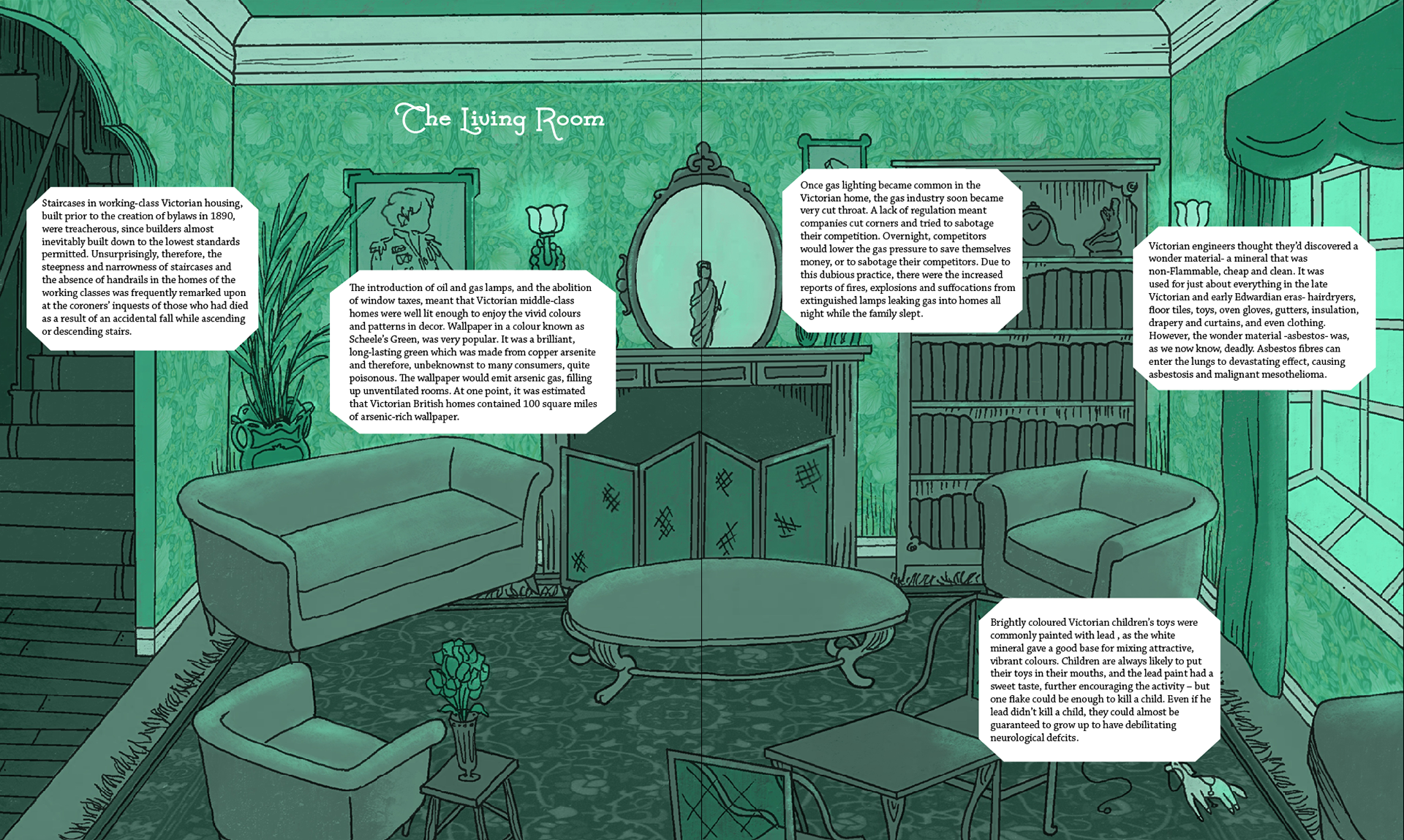 A research project focussed on the ways victorians were unknowingly poisoning themselves, and was made into a hidden flap book. Emphasis was put on environment design.