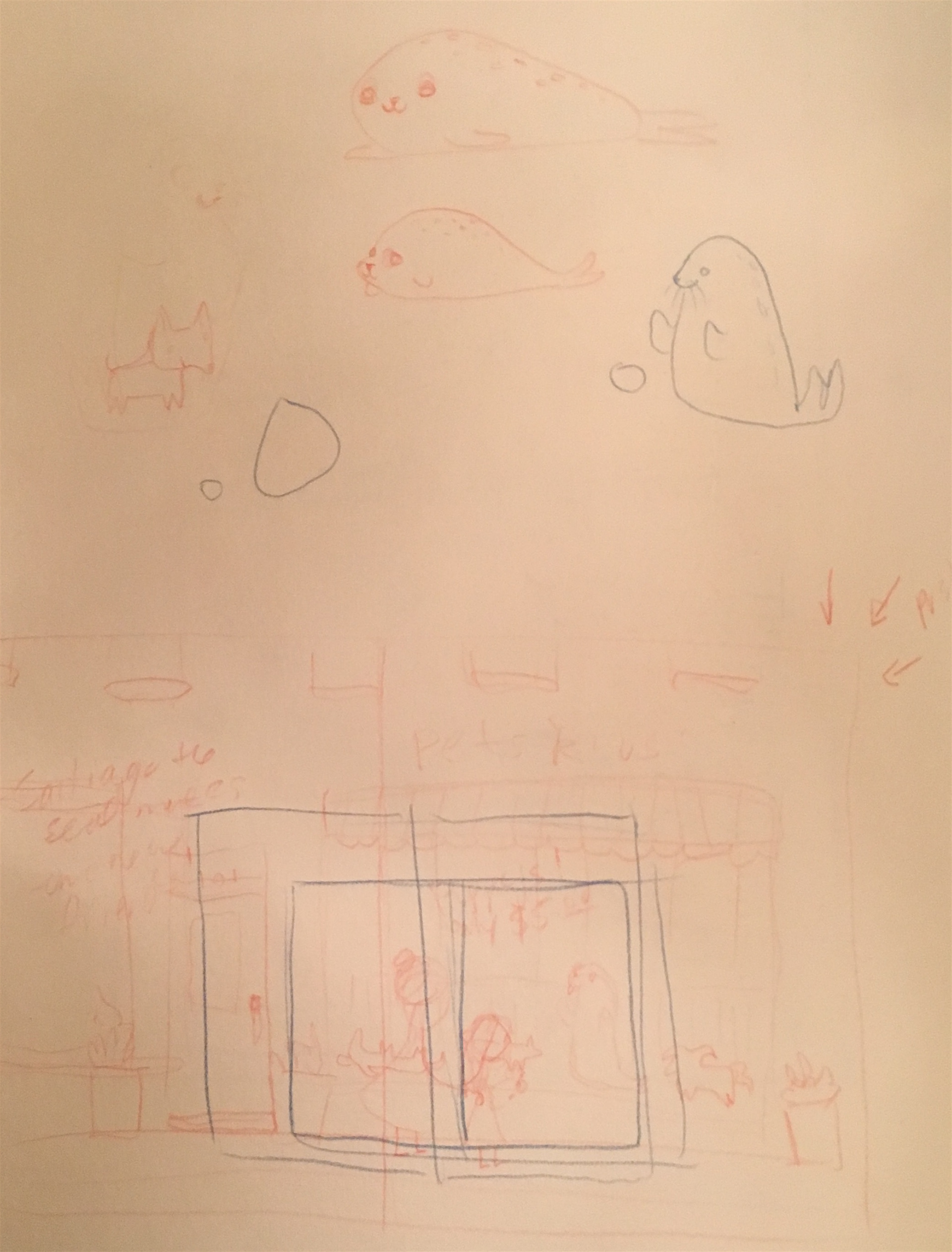 A spread for a children's book in which zoo animals have escaped into the city. My character is Santiago the spotted seal.