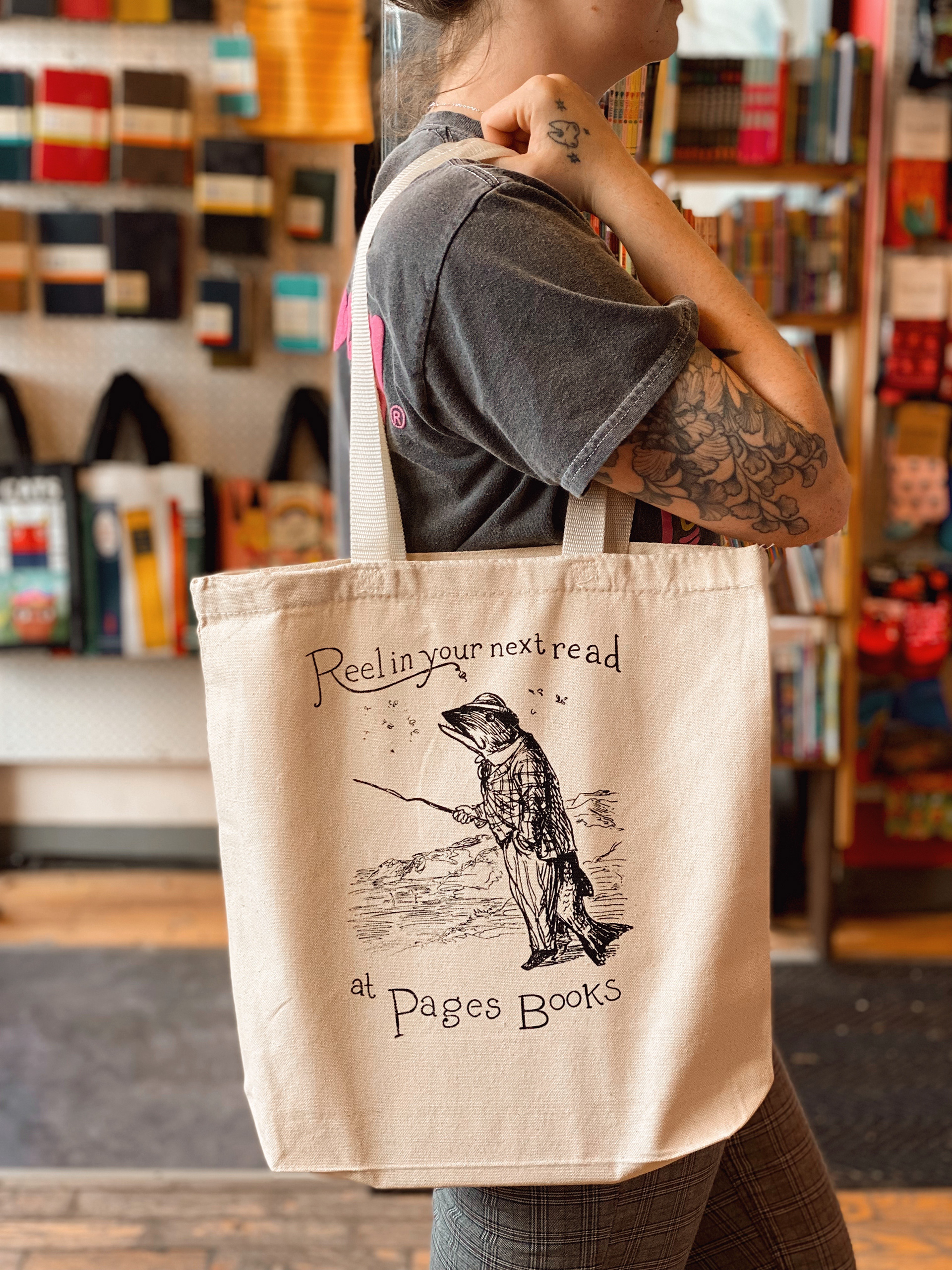 Custom tote bags for Pages Books. Designed by myself using public domain images and original illustration. Screen printing by Elise Mullen. Calgary, AB. 2023